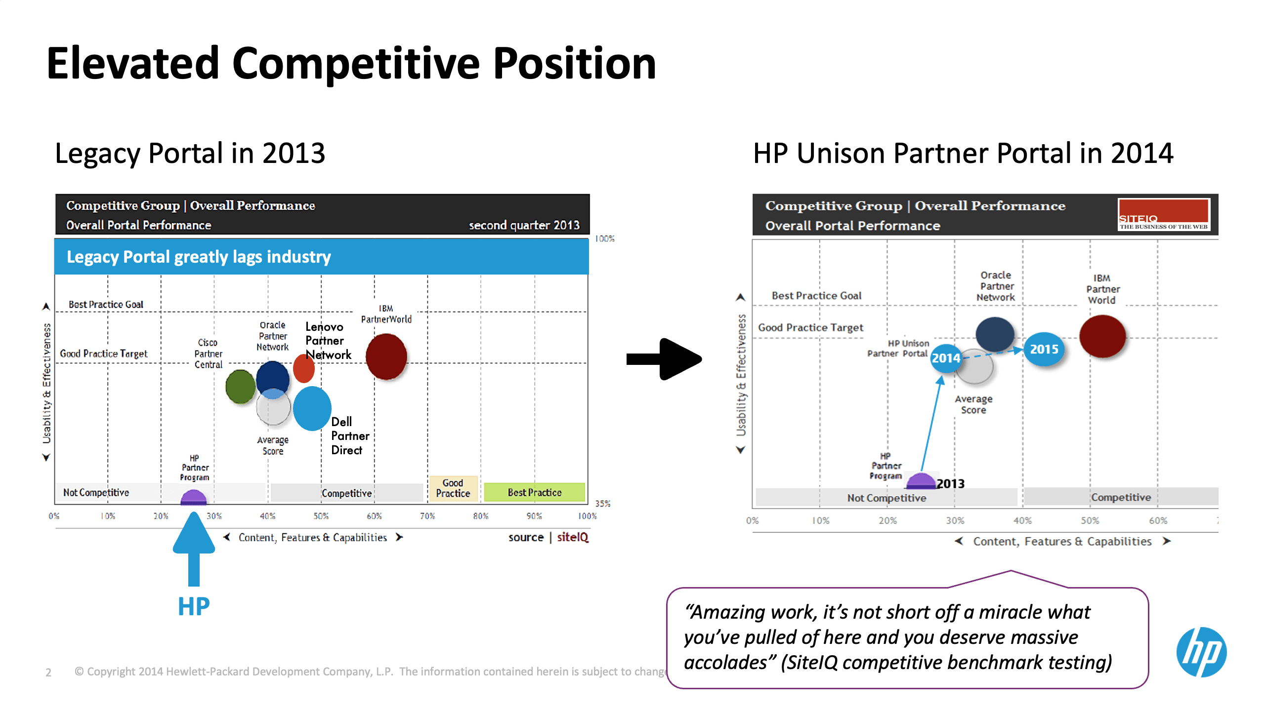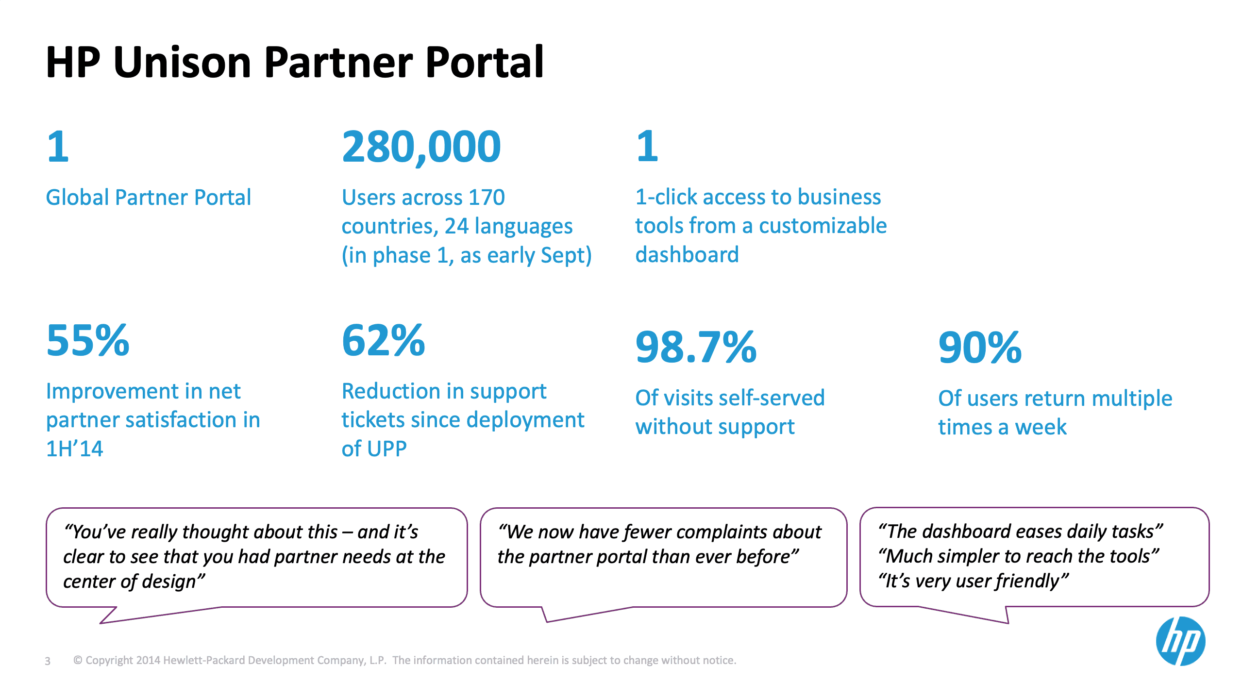 Following the launch of the HP Unison Partner Portal, an independent study showed that HPās portal was leading its competitors in three of the 12 categories of the benchmark established during the initial evaluation.